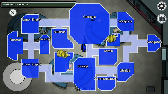 crewmates carry out their individual tasks. The spaceship map ‘THE SKELD’ has